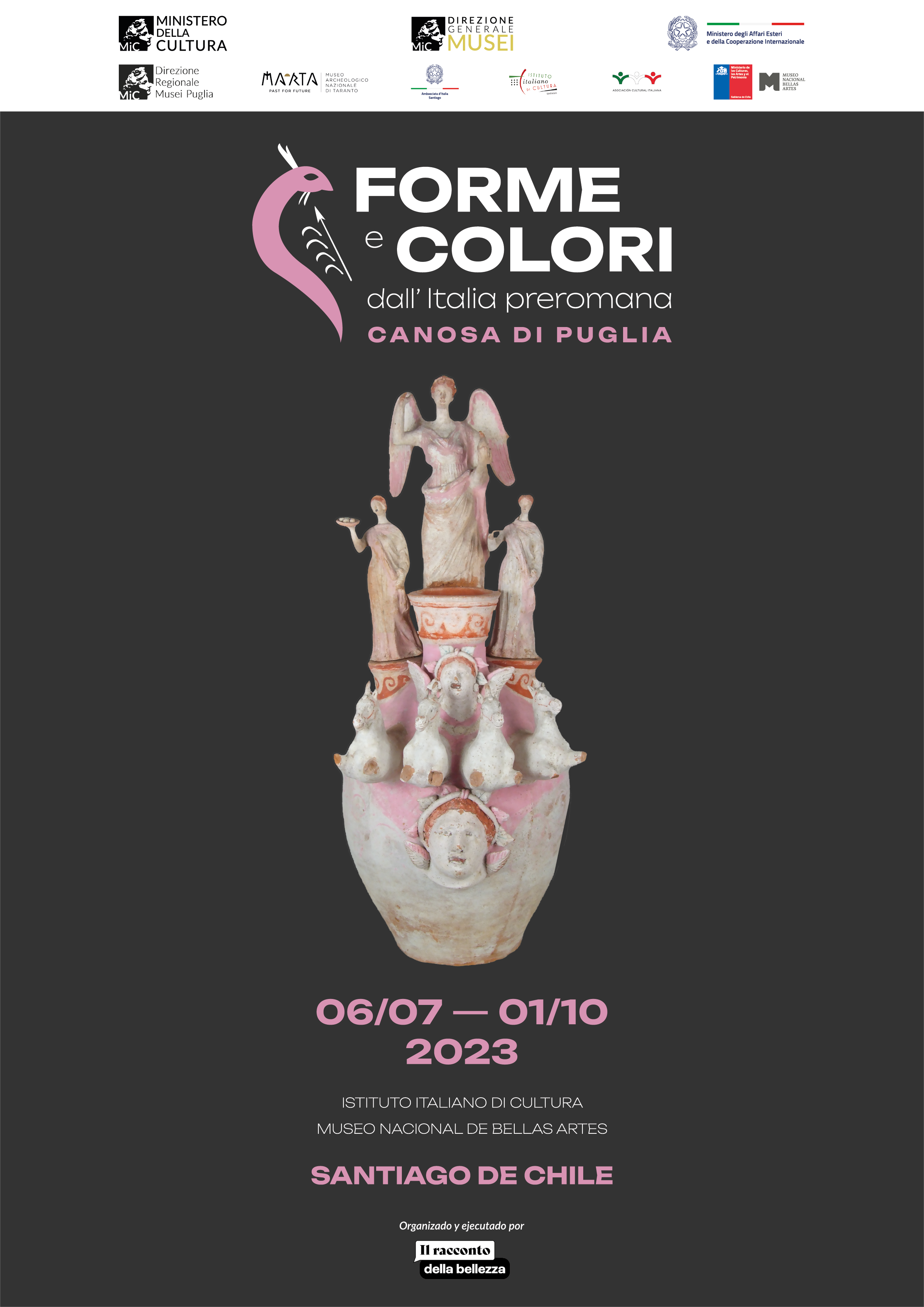 La mostra, curata da Massimo Osanna, Direttore generale Musei, e da Luca Mercuri in qualità di Direttore regionale Musei Puglia, sarà visitabile all’Istituto di Cultura di Santiago del Cile fino al 1 ottobre 2023, per essere poi trasferita a Buenos Aires (ottobre 2023 – gennaio 2024), San Paolo del Brasile (febbraio – maggio 2024) e Città del Messico (maggio – agosto 2024).