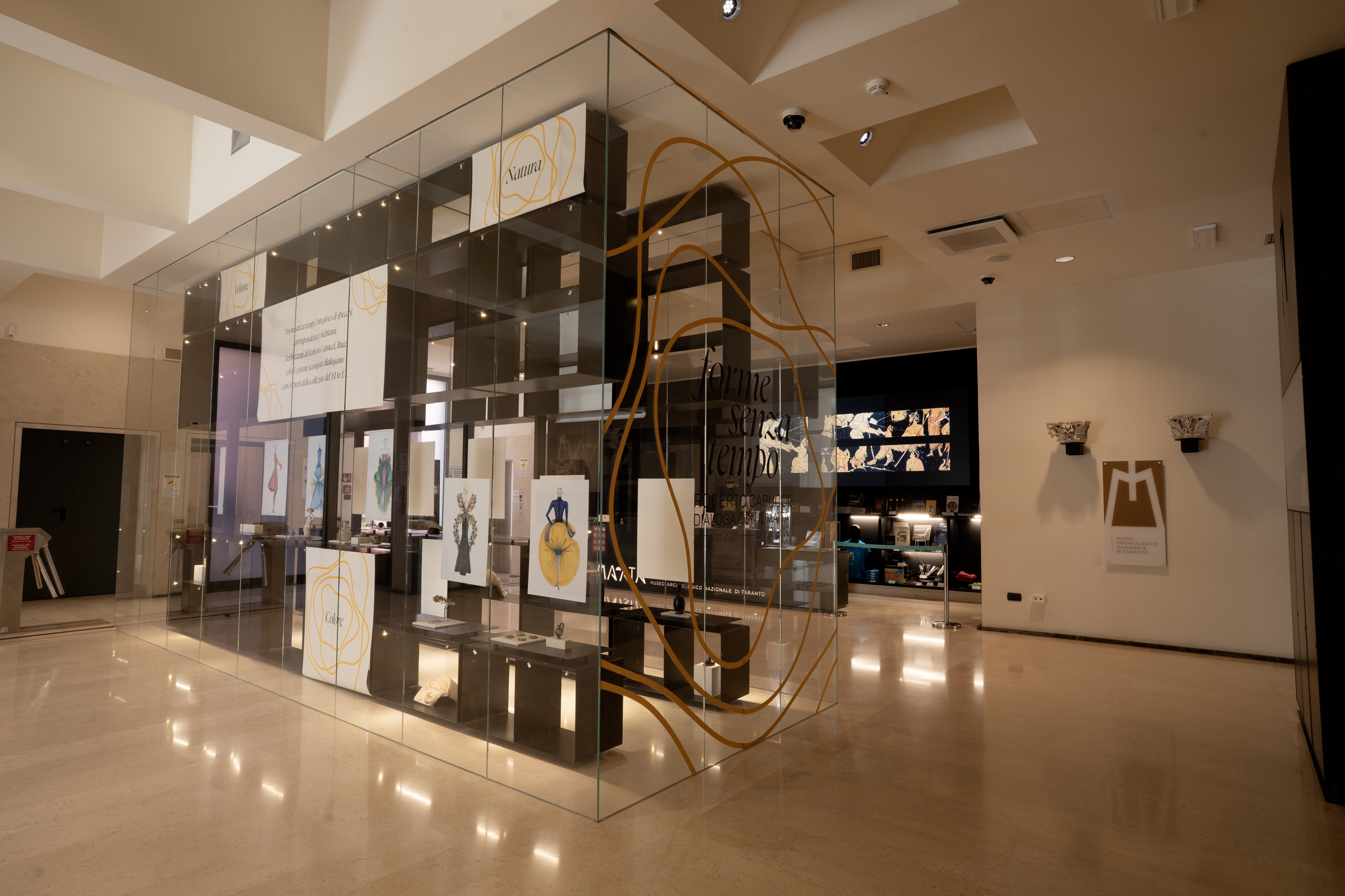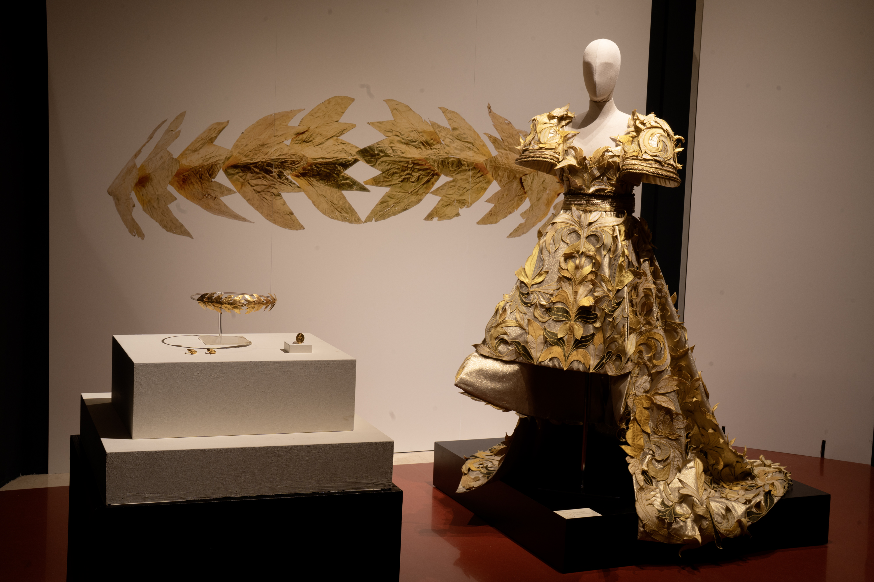 In esposizione venti abiti di alta sartoria dello stilista e architetto della moda Roberto Capucci, settanta disegni tra schizzi e foto d’epoca in dialogo con il mondo delle civiltà antiche. Una relazione fortissima che diventa ancora più efficace quando nell’installazione si incontra uno dei pezzi iconici firmati Capucci: il celebre abito ribattezzato Foglie d’Oro che svela sorprendenti connessioni con i diademi greci in oro conservati nel Museo.