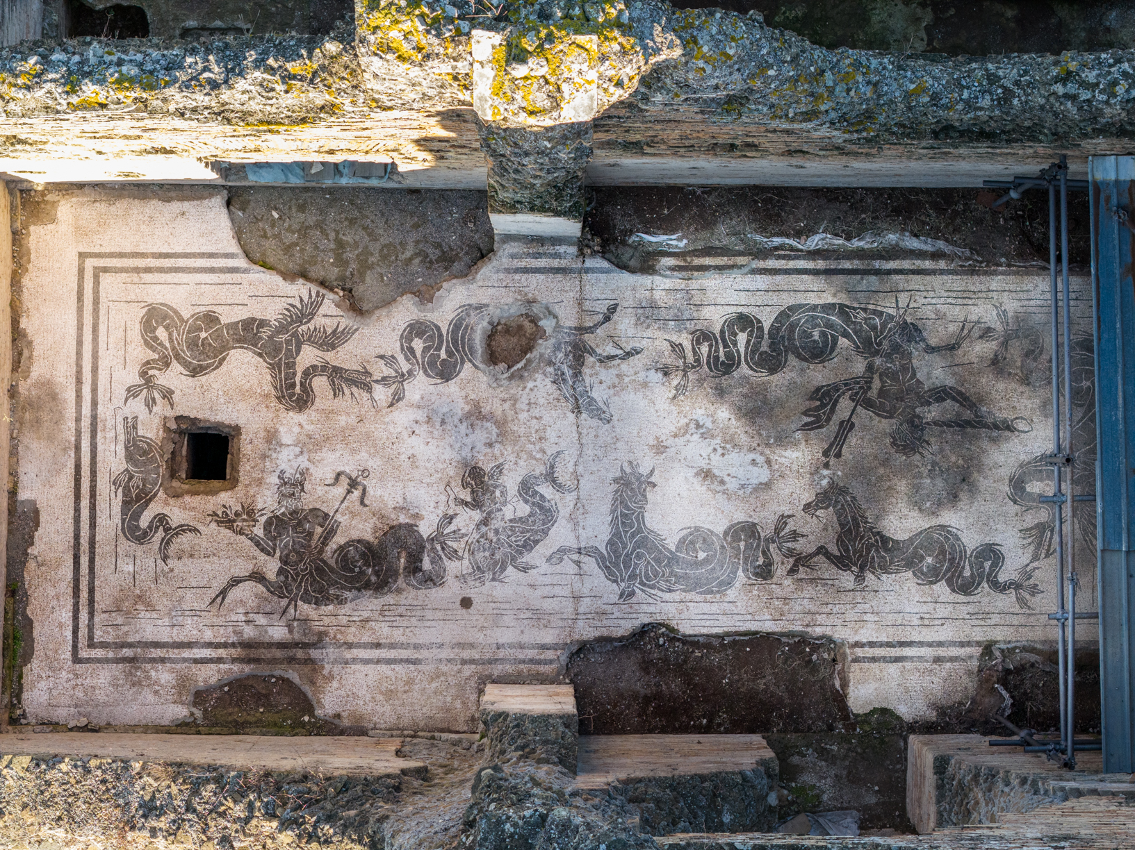 Le terme, databili alla metà del II secolo d.C., conservano un esteso e pregevole impianto musivo in tessere bianco nere con raffigurazione di un thiasos marino, sviluppato per quasi 60 m² e giunto fino a noi in ottime condizioni.
